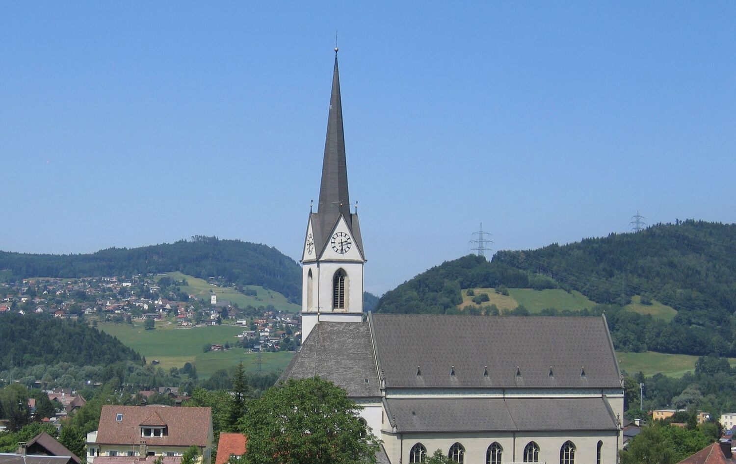 Bei der neuen Kirche wurde die Apsis nach Südwesten gelegt. Zum Hauptportal führen zwei Stiegen empor, welche heute zudem das Kiegerdenkmal von Albert Berchtold (1935) umfangen. Im Jahre 1344 wurde Frastafeders zerstört, wahrscheinlich von den Werdenbergern. Die Steine der Ruine verwendete man im 15. Jahrhundert für einen gotischen Kirchenneubau, dessen Apsis 9x6m maß. Diese Kirche ist nach barocker Umgestaltung bis 1885 gestanden. 1885 kam - durch Änderung der Mehrheitsverhältnisse - der Entschluß zum Durchbruch, die Pfarrkriche zu erneuern.