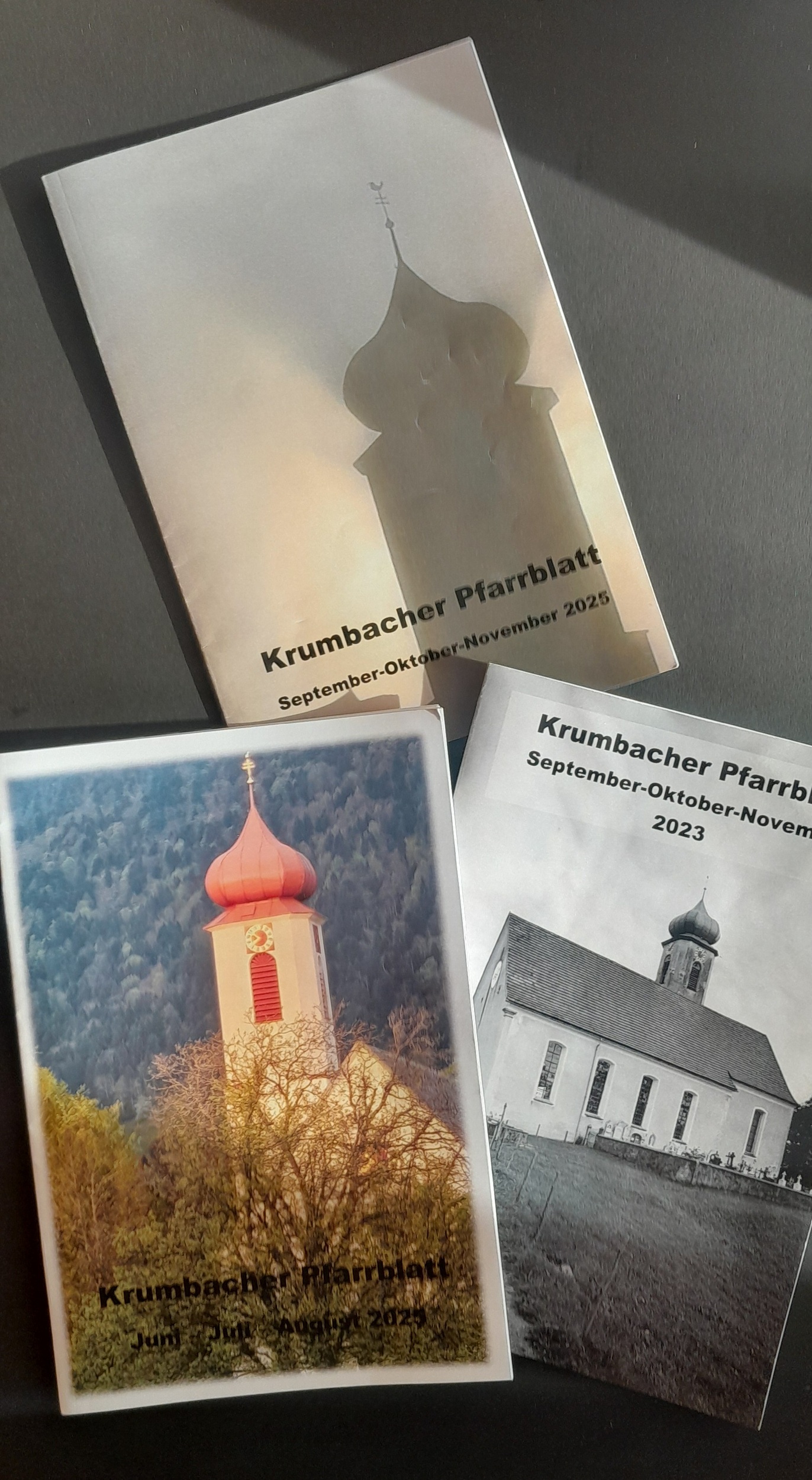 Mit dem Krumbacher Pfarrblatt erhalten unsere Mitmenschen vor Ort aktuelle Infos aus der Pfarre! Das Pfarrblatt wird 4 x im Jahr ausgeliefert. Falls Du eine Ausgabe verpasst hast, kannst du sie gerne hier nachlesen!