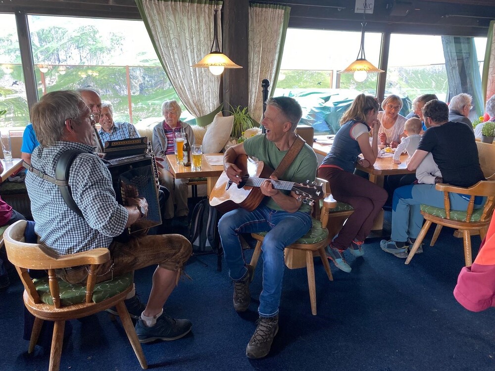 Elbert und Manfred sorgten mit ihren Instrumenten für eine tolle Stimmung. Von der Terrasse aus hatten wir die Wildgrubenspitze mit 2.753 m direkt vor uns und konnten auch das majestätische Gipfelkreuz bestaunen. Dieses Kreuz wurde vor 50 Jahren auf den Schultern einiger Männer zum Gipfel getragen und ist Symbol für die Verbundenheit mit der Natur und dem Glauben. Die anwesenden Träger berichteten von der Organisation und der Mühe dieser gefährlichen und schweißtreibenden Aktion. Durch diese Feier mit den Anwesenden wurde dies besonders gewürdigt und unterstrich die Bedeutung dieses Kreuzes für die Gemeinschaft.