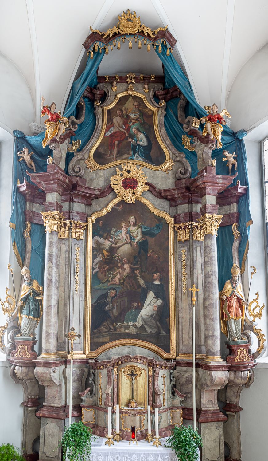 Beim Betreten des Innenraums zieht es den Blick zuerst auf den wunderbaren Hochaltar, der schön in den Chorraum eingefügt ist und von den hellen Fenstern beleuchtet wird. Der Altar stammt von Johann Steurer aus dem Jahr 1776 und entstand vermutlich nach Plänen von Johann Michael Koneberg. Er ist aus Holz gebaut und mit Marmorfaserung bemalt. Gerade Säulen und viele sanfte Schwingungen rahmen das große Altarbild.