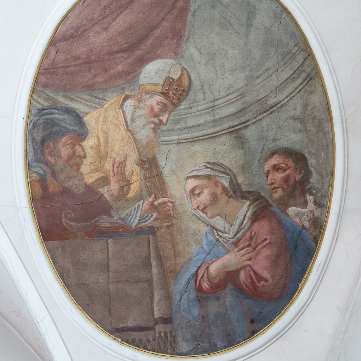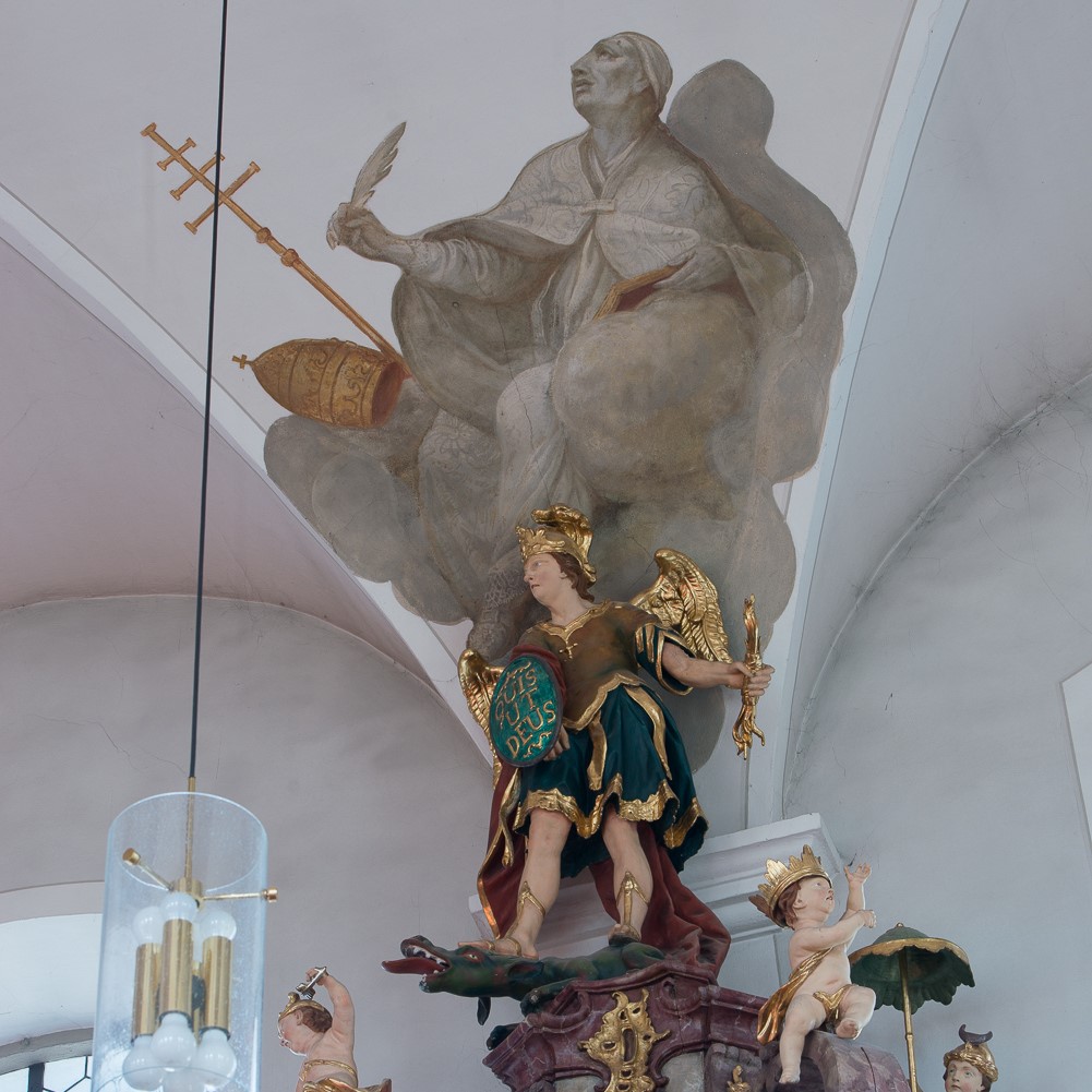 Da die Pfarrkirche ursprünglich dem Fest Maria Lichtmess (Maria Reinigung) geweiht war, befinden sich an der Decke vorwiegend Fresken aus dem Leben Marias und zwar drei große in der Mitte der Decke und vier Medaillons in den abgerundeten Ecken.
