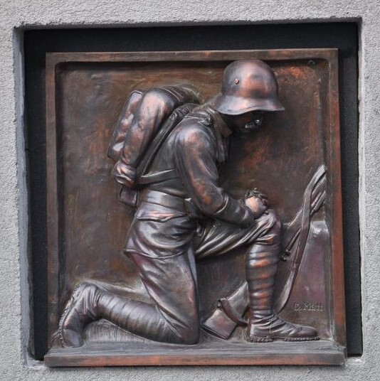 „Die bestehende Urnenwand wird durch die Neugestaltung auch ein neuer Ort für das Gedenken an die Opfer der beiden Weltkriege. Die beschrifteten Steinplatten aus samtig wirkendem grauem Granit ergeben eine einheitliche Gestaltung und stehen für die Gleichheit im Tod. Auf den beiden Relieftafeln sind Tore in Flügelform dargestellt als Symbol für den Übergang zwischen den Welten. Zusammen mit dem Relief des Soldaten entsteht somit eine Metapher für das Leben, die Verwandlung und das Überschreiten von Grenzen.“ Albrecht Zauner