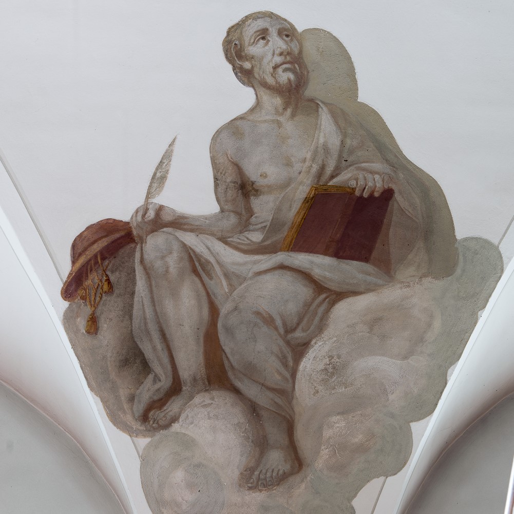 Rechts hinten folgt noch der Kirchenvater Hieronymus als Eremit mit nacktem Oberkörper, Kardinal und Bibelübersetzer.