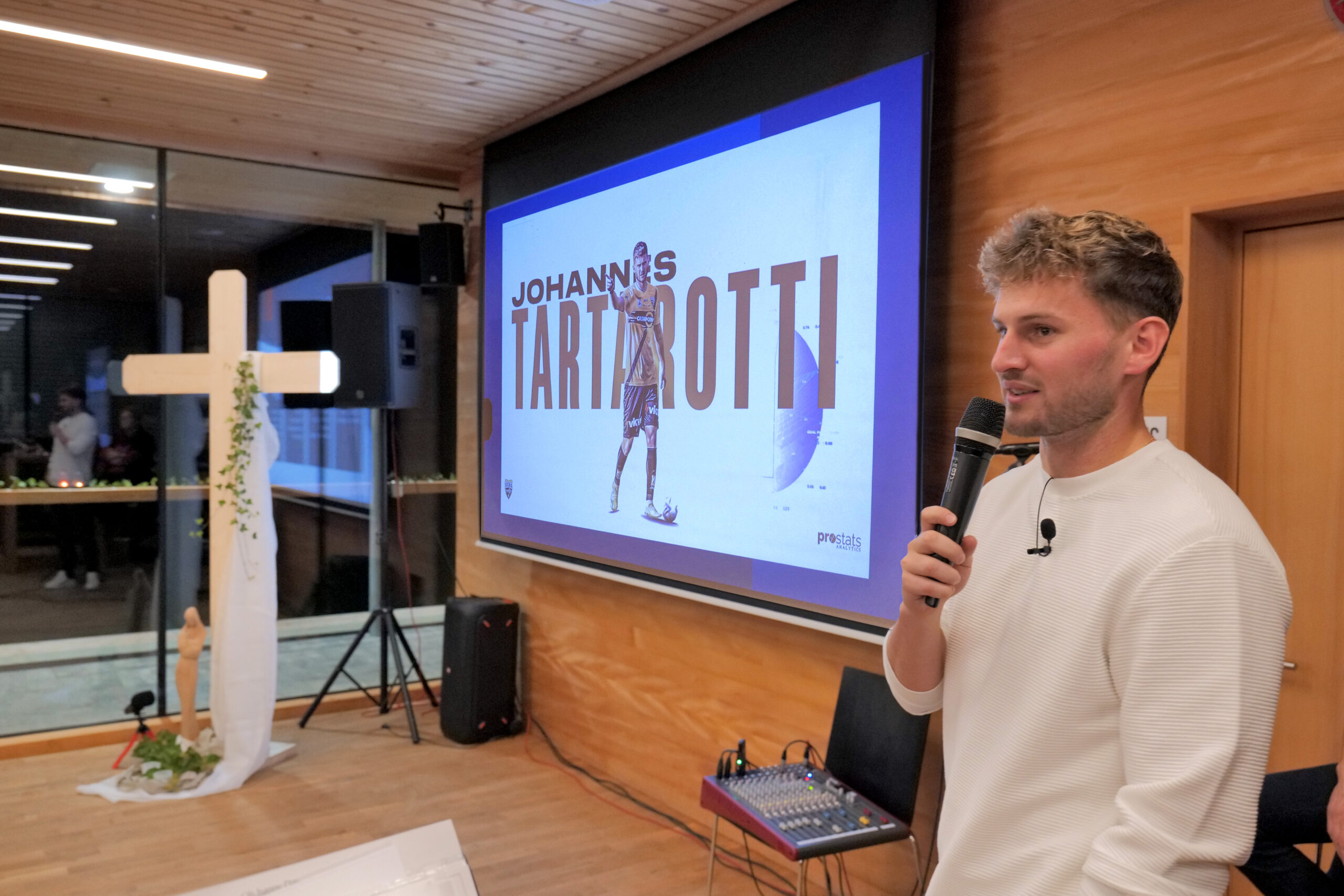 Ein Höhepunkt des Abends war der Impulsvortrag des jungen Profifußballers Johannes Tartarotti, der offen und authentisch Einblick in sein persönliches Glaubensleben gab. Mit beeindruckender Ehrlichkeit sprach er darüber, wie sein Glaube ihm in Höhen und Tiefen des Profisports Halt gibt. Musikalisch wurde der Abend von Manfred Wohlgenannt, Brigitte Wolf und Barbara Herburger getragen, die mit modernen Lobpreisliedern und berührenden Klängen eine besondere Atmosphäre schufen.