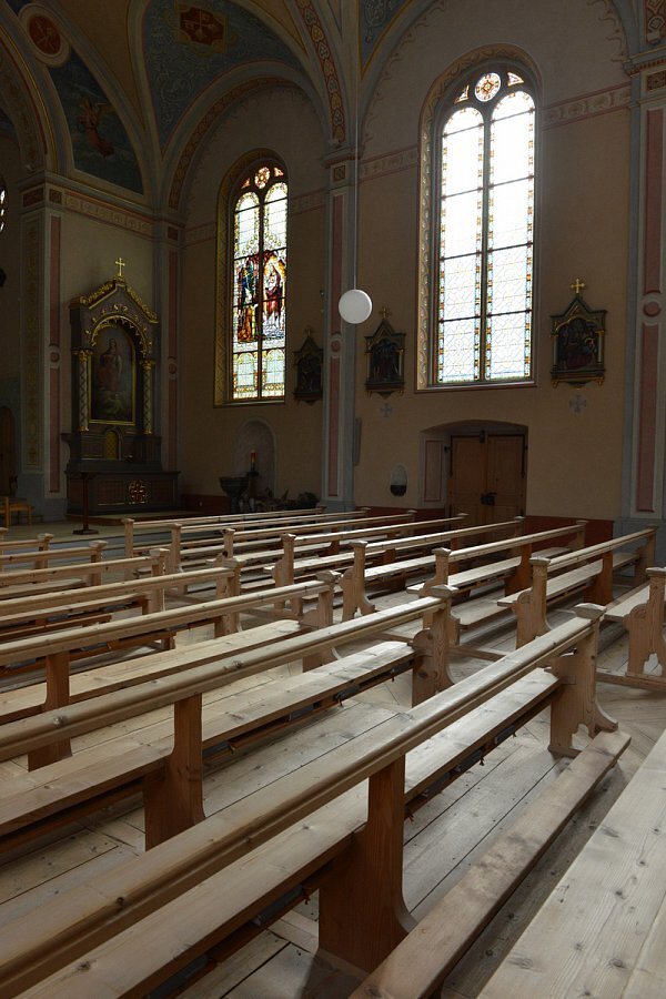 Neuromanische Kirche, 1867 Abbruch der alten Kirche, 1867/68 Neubau nach Plänen von Johann Meyer, 1869 geweiht.
