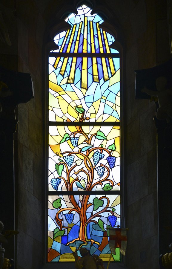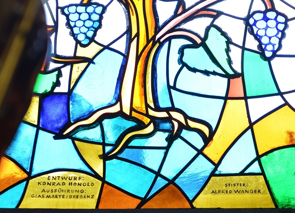 Chor Mitte: Osterfenster: "Die Kirche, der Weinstock Christi", Entwurf Konrad Honold, Ausführung Glas Marte Bregenz, Stifter Alfred Wanger