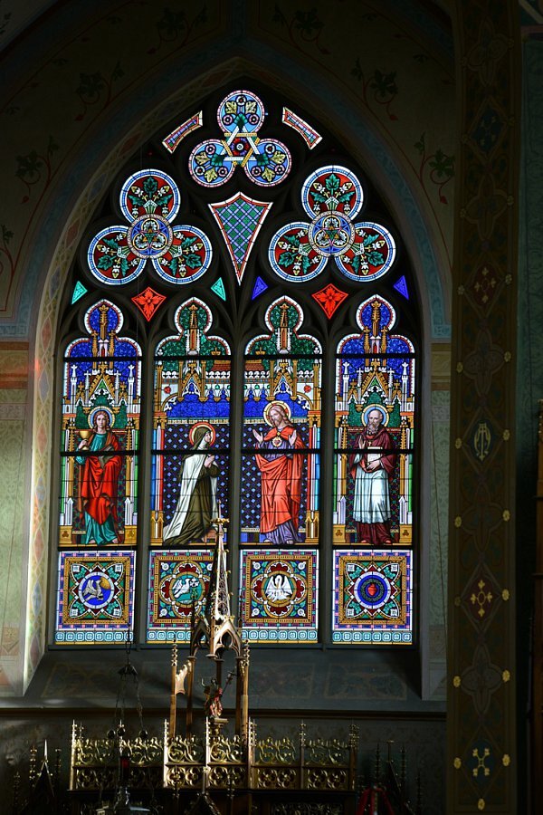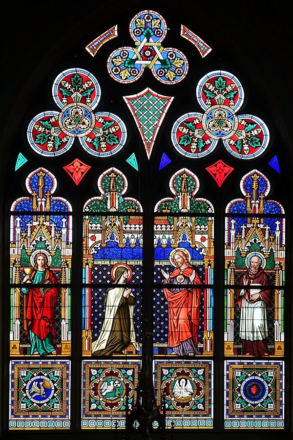 Weiler, Pfarrkirche zum Heiligsten Herzen Jesu, Chor: hl. Johannes Evangelist, Herz Jesu mit hl. Margaretha von Alacoque, hl. Franz von Sales, 1875 Tiroler Glasmalerei