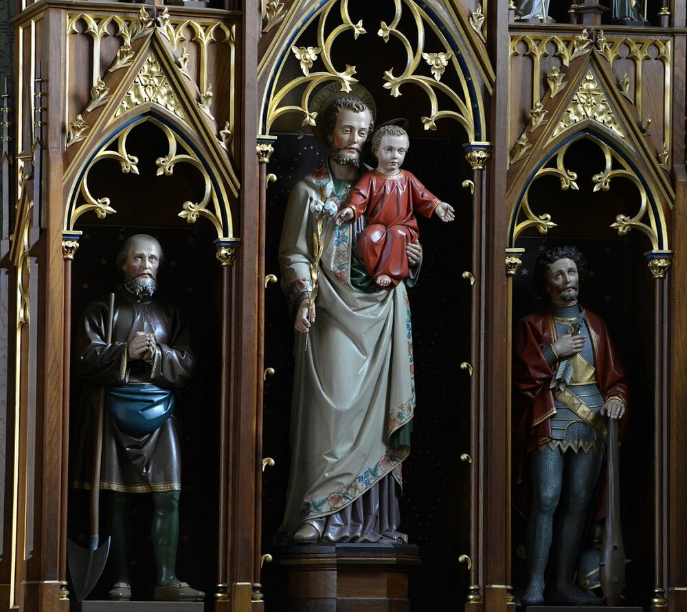 Weiler, Seitenaltar 1880- 82, hl. Isidor mit Schaufe, Hl. Josef, hl. Sebastian, 1880-82